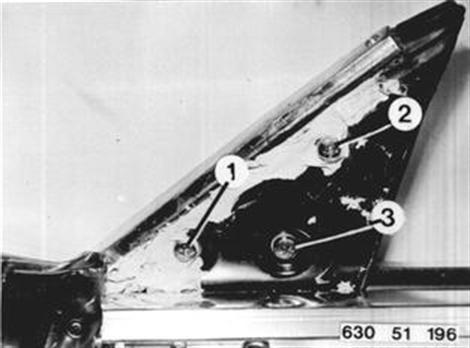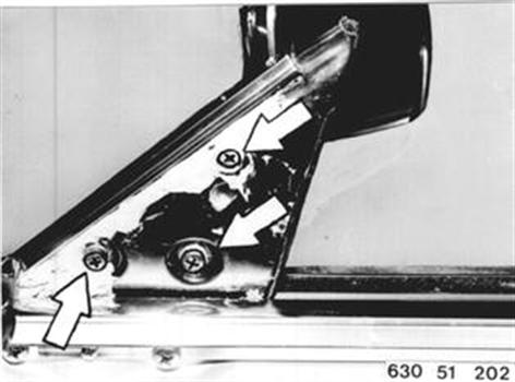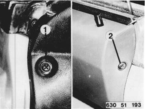 Türbrüstung vorne und hinten von Tür abbauen. Unten aus Klammern ausheben und abnehmen. Einbauhinweis: Schraube (1) vorne = Blechschraube, Schraube (2) hinten = Gewindeschraube. | ![]() |