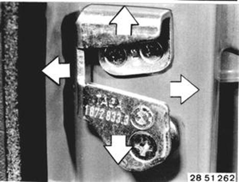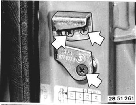 Fahrzeuge nach Modellwechsel 1982 TÜRRASTE VORN LINKS ODER RECHTS ERSETZEN B-Säulenverkleidung ausbauen 51 43 150. Schrauben lösen. Türraste abnehmen. Einbauhinweis: Blechplatte ausrichten. Ggf. Einbaulage markieren. Siehe technische Daten