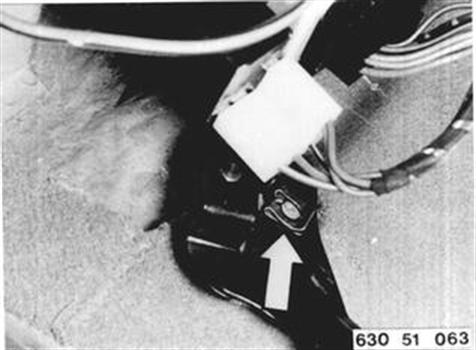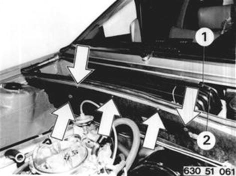Fahrzeuge nach Modellwechsel 1982 ZUG FÜR FRONTKLAPPENVERSCHLUSS AUS- UND EINBAUEN Verkleidung für Instrumententafel unten links ab- und anbauen 51 45 180. Schrauben (1...2) links und rechts lösen. Schrauben vorne heausdrehen und Abdeckung für Heizgebläse abnehmen. 51 45 180
