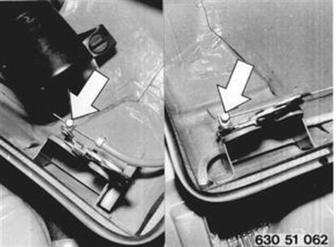 Sicherung abdrücken und Bock mit Hebel abnehmen. Drahtzug aushängen und herausziehen. Einbauhinweis: Frontklappenverschluß einstellen 51 23 004. 51 23 004