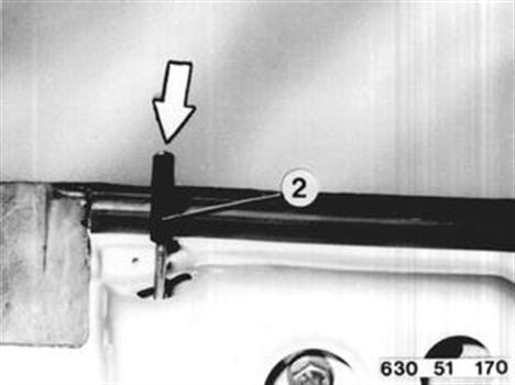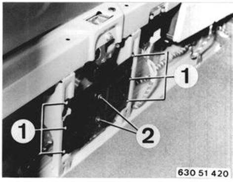 Schrauben (1 ... 2) lösen. Halteblech auf einer Seite abbauen und Schalter herausnehmen. Einbauhinweis: Darauf achten, daß Betätigungsstange (3) für Zentralverriegelung sich in der vorhandenen Führung befindet. | ![]() |