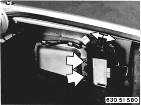 Ggf. Steckverbindung trennen. Schrauben lösen. Verstärker und Blech ausheben. Einbauhinweis: Auf richtigen Sitz des Verriegelungsgestänges achten. |  |