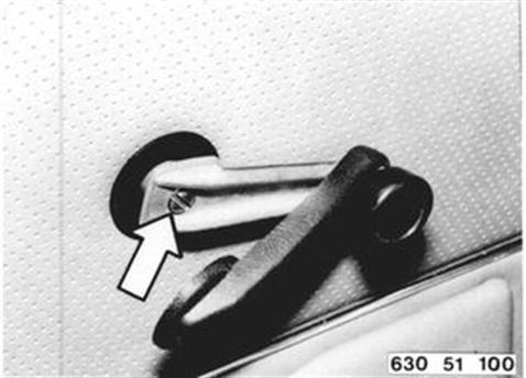 Ggf. Abdeckung von Fensterkurbel ausheben. Schraube lösen und Fensterkurbel mit Rosette abnehmen. Einbauhinweis: Fensterkurbel bei geschlossenem Fenster nach vorne oben. | ![]() |