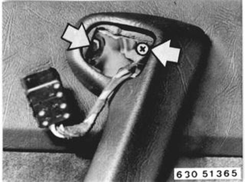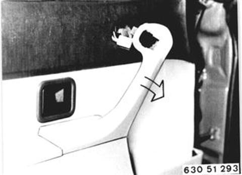 TÜRVERKLEIDUNG VORNE AB- UND ANBAUEN Armstütze an Vordertür ab- und anbauen 51 41 060. Abdeckung von Türinnengriff ausheben. Schraube lösen und Türinnengriff mit Rosette abnehmen. Einbauhinweis: Türinnengriff muß etwa waagerecht stehen. 51 41 060
