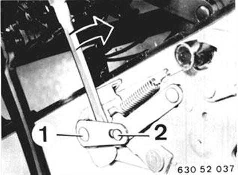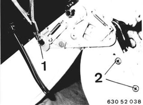Ohne elektrische Sitzverstellung: Hebel (1) mit Schraubendreher aushebeln. Einbauhinweis: Hebel (1) in Bolzen (2) und Übertragungsrohr für linke Seite einrasten. |  |