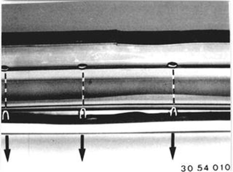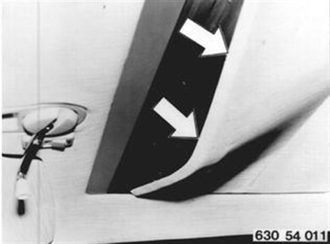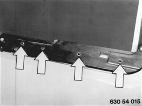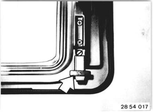 Fahrzeuge nach Modellwechsel 1982  SCHIEBE-HEBEDACH-DECKEL AUS- UND EINBAUEN Schiebe-Hebedach ganz öffnen. Schrauben lösen. Führungsleisten links und rechts abnehmen. Einbauhinweis: Führungsleisten mit Vaseline fetten. An den vorderen Ecken Terostatschnur einlegen. |  |