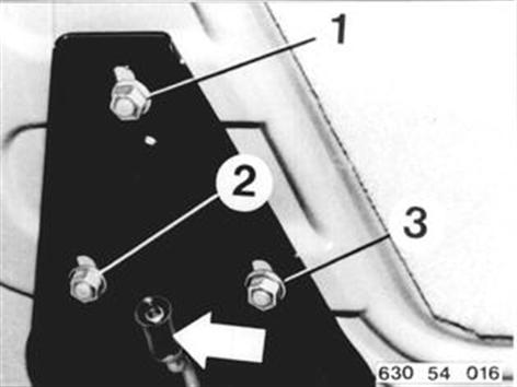 Muttern (1 ... 3) links und rechts lösen. Stahlkurbeldach-Deckel herausnehmen. Einbauhinweis: Stahlkurbeldach-Deckel hinten an Halter anbauen, dazu Halter leicht nach innen ziehen. Kulissenhalter von Hand und mit Hilfe des Getriebes zurückschieben. |  |