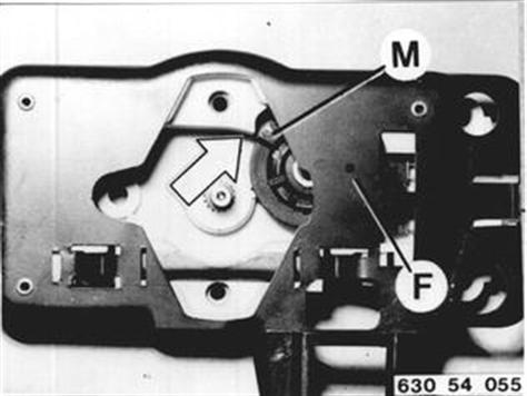 Einbauhinweis: Getriebe in Grundeinstellung bringen. Markierung (M) am großen Ritzel, muß der Außenkante des Gehäuses gegenüberstehen und Ritzel muß sich bei der Fixierbohrung (F) arretieren lassen. Getriebe einbauen. |  |