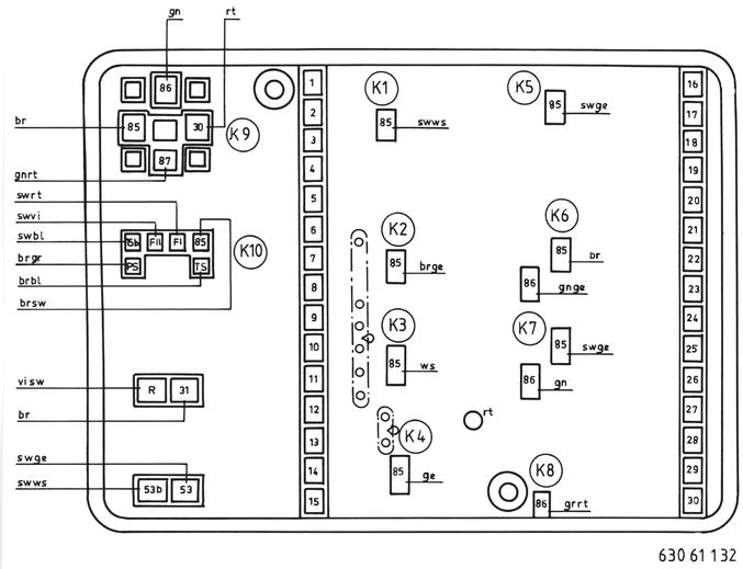 StromverteilerbelegungsplanKennzeichnung: bl = blau br = braun ge = gelb gn = grün gr = grau rt = rot sw = schwarz vi = violett ws = weiß tr = transparent Relais: K1 = Zusatzlüfter St. I K2 = Fanfare K3 = Fernlicht K4 = Fahrlicht K5 = Heizgebläse K6 = Zusatzlüfter St. II K7 Entlastung K8 = Nebelscheinwerfer K9 = Schiebedach, Fensterheber (US/J) K10 = Steuergerät f. Intensivreiniger | Sicherung Nr. | Nennstrom (A) | Ltg.-Farbe | | 1 | 7,5 | wsvi | | 2 | 7,5 | wsbl | | 3 | 25 | swbl | | 4 | 15 | vigr | | 5 | 25 | visw | | 6 | 7,5 | vign | | 7 | 15 | vige | | 8 | 30 | gnbl | | 9 | 7,5 | gnge | | 10 | 7,5 | gnws | | 11 | 15 | gnvi | | 12 | 7,5 | viws | | 13 | 7,5 | gews | | 14 | 7,5 | gebl | | 15 | 7,5 | gesw | | 16 | 30 | gnbr | | 17 | | | | 18 | 30 | swgn | | 19 | 30 | gnrt | | 20 | 25 | gnbl | | 21 | 7,5 | rtgn | | 22 | 7,5 | grsw | | 23 | 7,5 | grgn | | 24 | 15 | rtws | | 25 | 25 | rtbl | | 26 | 25 | rtgr | | 27 | 25 | rtsw | | 28 | 25 | rtge | | 29 | 7,5 | gebr | | 30 | 7,5 | gevi |