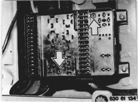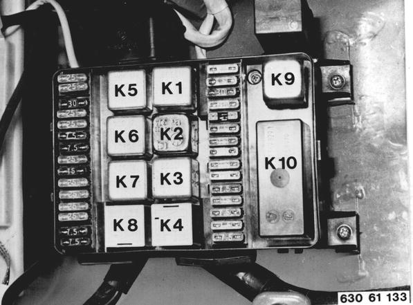 Fahrzeuge nach Modellwechsel 1982 GERÄTETRÄGER FÜR STROM VERTEILER ERSETZENAbdeckung abnehmen. Alle Relais und Sicherungen herausziehen. Hinweis:Bei Fahrzeugen mit Diebstahlwarnanlge ist die Abdeckung geschraubt. | Sicherungs Nr.*) | Nennstrom | (A) Benennung | | 1 | 7,5 | Fernlichtscheinwerfer links, Fernlichtkontrolle | | 2 | 7,5 | Fernlichtscheinwerfer rechts | | 3 | 30 | Zusatzlüfter 91° C (StufeI) (nur bei KA) | | 4 | 15 | Fahrtrichtungsanzeiger mit Kontrolle | | 5 | 30 | Wisch-Wasch-, Scheinwerferreinigungs- und Intensiv- | | | reinigungsanglage, beheizbare Spritzdrüsen | | 6 | 7,5 | Bremslicht, elektr. Geschwindigkeitsregelanlage | | 7 | 15 | Fanfare links und rechts | | 8 | 30 | Heizbare Heckscheibe | | 9 | 7,5 | Diagnosestecker KL. 15 | | 10 | 7,5 | Rückleuchte, Instrument, Check-Control Anzeige | | 11 | 15 | Kraftstoffpumpe, Vorförderpumpe | | 12 | 7,5 | Radio-, Bordcomputer-, Display-Beleuchtung | | 13 | 7,5 | Fahrtlicht links | | 14 | 7,5 | Fahrtlicht rechts | | 15 | 7,5 | Nebelschlußlicht, Kontrolle für Nebelschlußlicht | | 16 | 15 | Sitzheizung | | 17 | 30 | - | | 18 | 30 | Zusatzlüfter 99° C (Stufe II Relais K 6 Laststromkreis) | | 19 | 30 | El. Spiegel, Niv. Reg, Memory Sitzverst., Heizungssteuerung | | 20 | 30 | Heizgebläse | | 21 | 7,5 | Innen-Handschuhfach, Gepäckraumleuchte, Handlampe, | | | Digitaluhr, Radiospeicher, Diebstahlwarnanlage, Bordcomputerspeicher, Gong | | 22 | 7,5 | Stand-, Schluß und Parklicht links, Kennzeichnungbeleuchtung | | 23 | 7,5 | Stand-, Schluß und Parklicht rechts, Instrumentenbeleuchtung, | | | Make-up-Spiegel, Motorraumbeleuchtung | | 24 | 15 | Warnblinkanlage | | 25 | 30 | Niveauregulierung | | 26 | 30 | Sitzverstellung | | 27 | 30 | Zentralverriegelung, Türschloßheizung, Diebstahlwarnanlage, | | | Horn | | 28 | 30 | Zigarettenanzünder, Automatikantenne, Standheizung | | 29 | 7,5 | Nebelscheinwerfer links, Kontrolle für Nebelscheinwerfer | | 30 | 7,5 | Nebelscheinwerfer rechts |