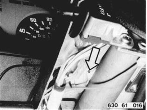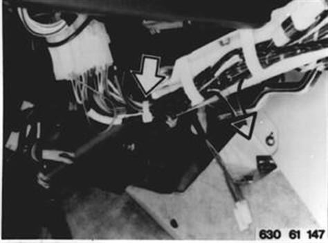 Obere Lenksäulenverkleidung anheben. Sperrhaken niederdrücken und Zündanlaßschalter abnehmen. Einbauhinweis: Stellung am Lenkschloß und Zündanlaßschalter beachten. |  |
