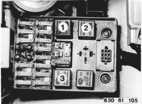 FAHRLICHT-RELAIS ERSETZEN Minusleitung an der Batterie abklemmen. Ralais aus Geräteträger herausziehen. 1 = Fernlicht-Relais 2 = Fahrlicht-Relais 3 = Fanfaren-Relais Einbauhinweis: Fabrikat¹) und Nr.¹) beachten.  ¹) Siehe technische Daten |  |
