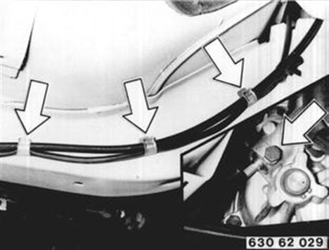 Tachowelle am Getriebe abbauen. Tachowelle aus Halteklemmen lösen und nach innen herausziehen. Einbauhinweis: Auf richtige Länge der Tachowelle achten. |  |