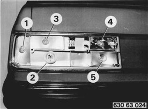 GLÜHLAMPE FÜR BLINKLEUCHTE HINTEN ERSETZEN Lichtfenster für Heckleuchte ab- und anbauen 63 21 000. Glühlampe(n) herausnehmen. 1 = Blinkleuchte 2 = Schlußleuchte 3 = Bremsleuchte 4 = Nebelschlußleuchte (nur links) 5 = Rückfahrscheinwerfer Einbauhinweis: Wattzahl¹) beachten.  63 21 000  ¹) Siehe technische Daten |  |