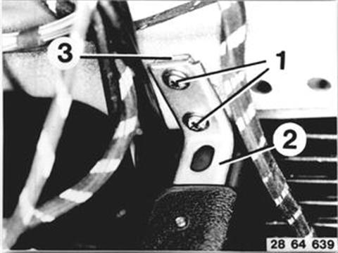 Schrauben (1) lösen und Stoßschalter abnehmen. Einbauhinweis: Distanzstück (3) zwischen Halter (2) und Querträger nicht vergessen. |  |