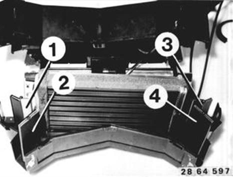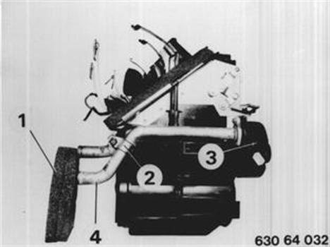 Schaumgummidichtung (1) abnehmen. Schelle (2) abbauen und Wasserventil (3) vom Heizkörper lösen. Verlaufrohr (4) bleibt am Wasserventil. Einbauhinweis: O-Ringe überprüfen, ggf. ersetzen.
