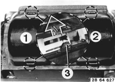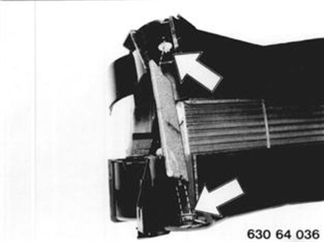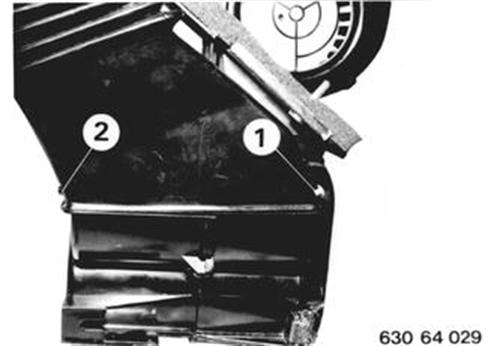 HEIZKÖRPER ERSETZEN -HEIZGERÄT AUSGEBAUT- Plastikniet (1) links und rechts herausziehen. Verbindungsstücke aus Haltezapfen (2) ausheben.