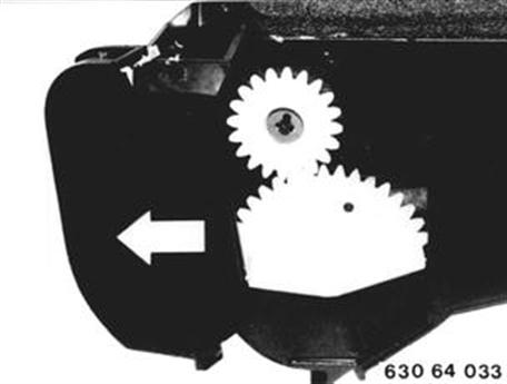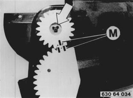Sicherung vom kleinen Zahnrad ausheben und Zahnrad abnehmen. Verbindungsstück herausziehen. Einbauhinweis: Einbaulage Zahnrad beachten. Markierung (M).