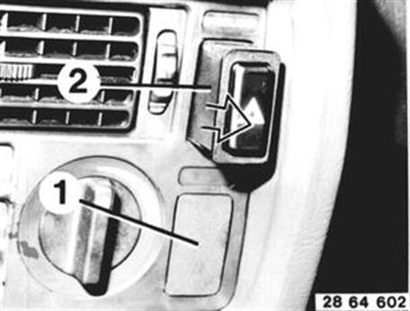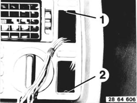 Blende (1) und Schalter (2) mit einem kleinen Schraubendreher (oder Messer) nach vorne herausziehen. Formstecker von Schalter (2) abziehen und Schalter (2) abnehmen.