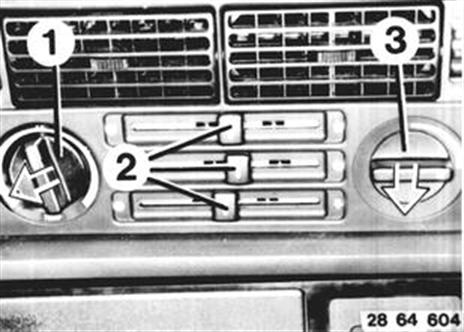 Griffe der Schieberegler 2 abziehen. Drehgriffe von Temperaturregler (1) und Gebläseregler (3) abziehen.