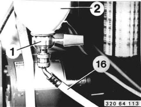 Absperrventil (4) öffnen und 1000 g Kühlmittel einsaugen lassen. Achtung! Fahrzeug während des Füllvorganges nicht starten. |  |