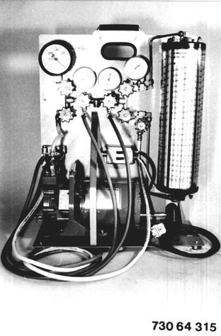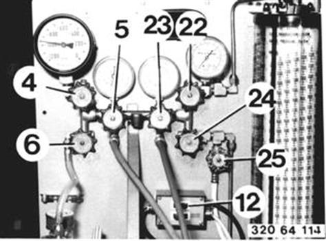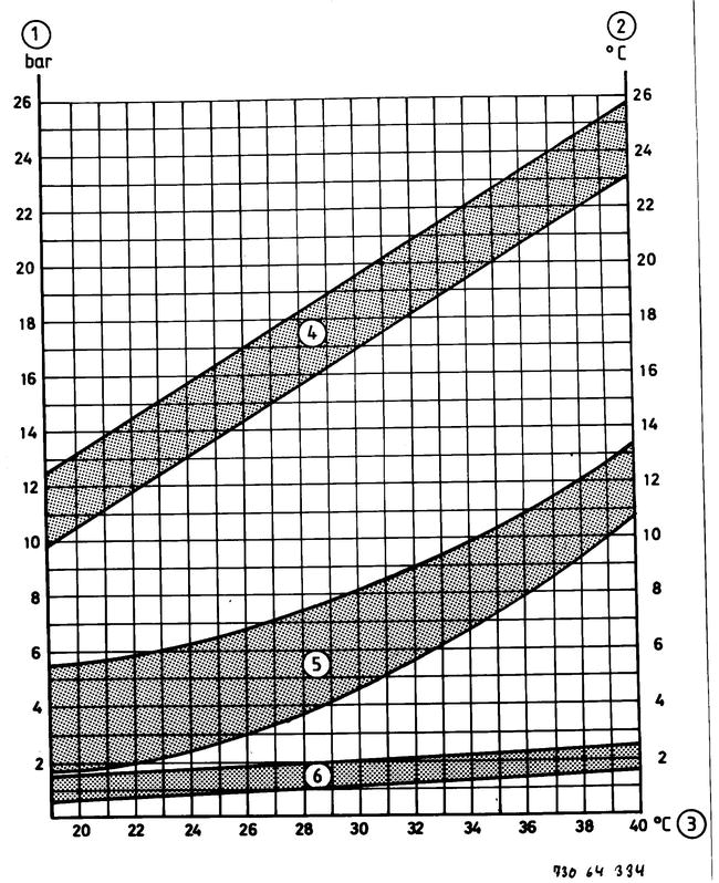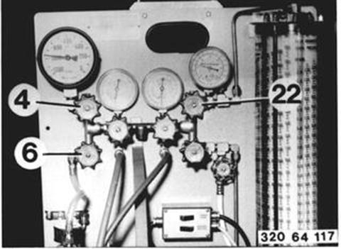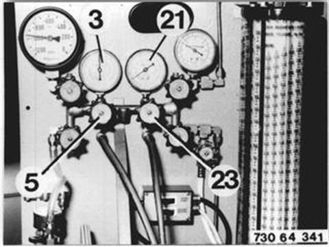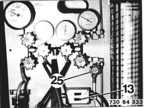 Alle Ventile der Evakuier- und Füllstation  schließen. Nur Füllventile (5) und (23) geöffnet. Betriebsdrücke an den Nieder-, bzw. Hochdruckmanometern (3 bzw. 21) ablesen und mit Sollwertgraphik 730 64 334 vergleichen. Jeweils immer nur einen Druckbereich prüfen. |  |