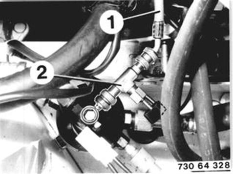 Füllschlauch (rot, 1) mit Ventilkernentferner  (2) von Hochdruckseite der Klimaanlage lösen. Mit Schutzkappe Anschluß der Hochdruckseite verschließen. |  |