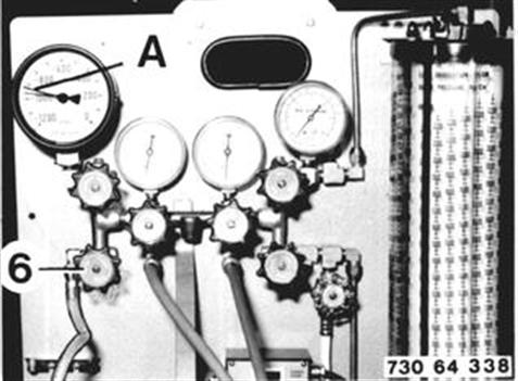 Nach erfolgtem Evakuieren: Absperrventil (6) schließen. Roten Stellzeiger (A) mit Anzeigewert markieren. Erfolgt kein Druckanstieg, ist die Klimaanlage ohne Feuchtigkeit und dicht. |  |