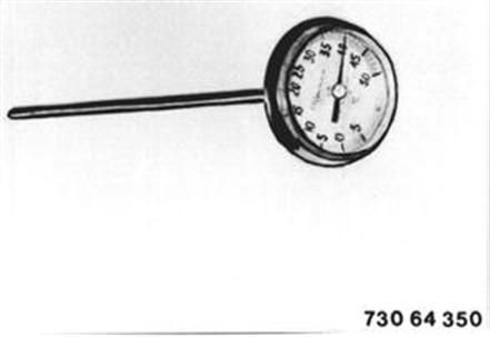 Kältemittelkreislauf prüfen: 1. Motor laufen lassen, bis Betriebstemperatur erreicht ist. 2. Frischluftklappen, Türen und Fenster schließen. 3. Thermometerfühler am Verdampfer, in Fondraum und außerhalb des Fahrzeuges befestigen. 4. Klimaanlage auf max. Leistung einschalten. 5. Motordrehzahl auf 2000/min. bringen. 6. Flüssigkeit im Schauglas der Trocknerflasche muß blasenfrei durchströmen. 7. Nach ca. 15 min. Betriebszeit Kaltluftaustritt am Verdampfer und Kompressionsdrücke¹) am Hoch- und Niederdruckmanometer ablesen. 8. Autom. Aus- und Einschalten der elektromagnetischen Kupplung überprüfen. 9. Während der Ablesezeit darf der Kompressor nicht über das Thermostat abgeschaltet sein. Nach erfolgter Überprüfung Schläuche vom Fahrzeug abmontieren und Anschlußstellen verschließen.  ¹) Siehe technische Daten |  |