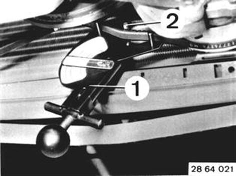 Fahrzeuge nach Modellwechsel 1982 KEILRIEMEN FÜR KOMPRESSOR DER KLIMAANLAGE NACHSPANNEN Unterschutz abbauen. Keilriemenspannung mit Prüfgerät (1) prüfen. Achtung! Der Zughaken (2) muß immer auf der Zahnspitze angelegt werden.