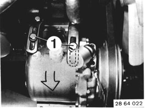 Nachspannen: Schrauben (1) lockern. Kompressor nach unten drücken. Schrauben wieder festziehen. Motor kurz starten, abstellen. Keilriemenspannung mit Prüfgerät prüfen.