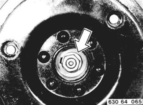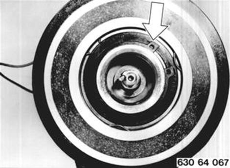 Federplatte mit 64 5 000 abdrücken. Achtung! Ausgleichscheiben. Einbauhinweis: Luftspalt zwischen Federplatte und Riemenscheibe mit Ausgleichscheiben auf ca. 0,7 ... 1,3 mm einstellen. | ![]() |