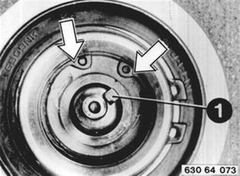 Federplatte mit 64 5 000 abdrücken. Achtung! Ausgleichscheiben. Einbauhinweis: Luftspalt zwischen Federplatte und Riemenscheibe mit Ausgleichscheiben auf ca. 0,7 ... 1,3 mm einstellen. |  |