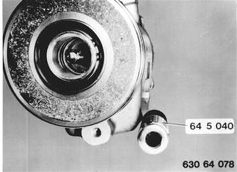 Einbauhinweis: Gleitringdichtung in 64 5 040 einsetzen und so einführen, daß die geraden Flächen in den vorgesehenen Ausschnitten in Kompressorwelle einrasten. |  |