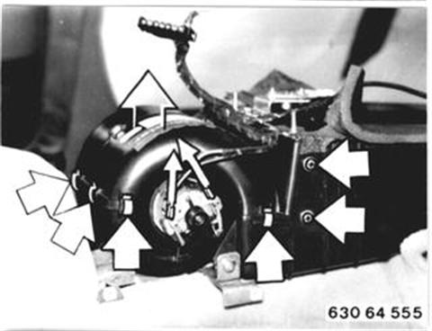 LÜFTERMOTOR ausbauen. Stecker abziehen. Schrauben rechts und links lösen. Klammern ausheben, Gehäuseoberteil mit Lüftermotor ausheben. Einbauhinweis: Auf richtiges Zusammensetzen der Gehäusehälften achten. | ![]() |
