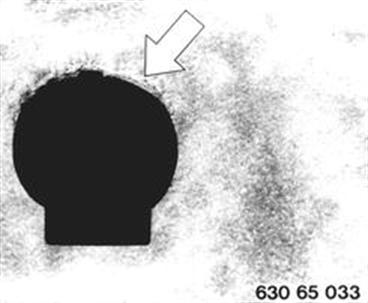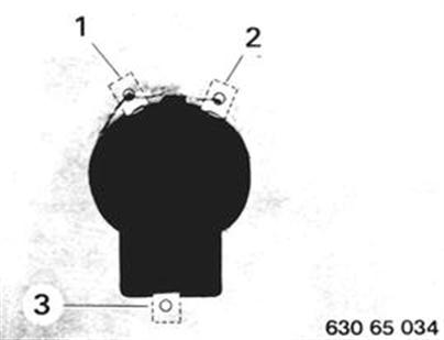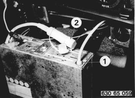 Verteilerkappe abbauen. Abschirmkappe (1) auf Verteilerkappe aufschieben und Verteilerkappe montieren. Massekabel (2) von Abschirmkappe an Schraube für Unterdruckdose befestigen. |  |