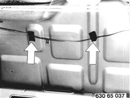 Zusatzkabel für Hecklautsprecher unter Ablegeboden verlegen. Kabel zwischen Deckelscharnier durchführen. |  |