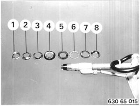 Gummitüllen, mit Wulst zum Fahrgastraum, auf Antennen- und Steuerkabel aufstecken. Einbaureihenfolge der Befestigungsteile: 1 ... 4 Außen auf Seitenteil 5 ... 8 Innen im Radhaus. Zackenring (6) mit den zwei Ansätzen in die Aussparungen des Zwischenstückes (7) einrasten. | ![]() |