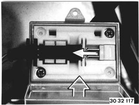 Fahrzeuge nach Modellwechsel 1982 Achtung! Sicherheitsvorschriften beachten. Batterie abklemmen und Minuspol bzw. -Klemme abdecken. Deckel öffnen, Stecker abnehmen und Schrauben lösen. Hinweis: Durch das Öffnen des Deckels wird der Sicherheits- schalter zerstört und muß erneuert werden. Sicherheitsschalter anschrauben. Stecker einsetzen, Kontaktbrücke zum Stecker schieben. Deckel schließen.