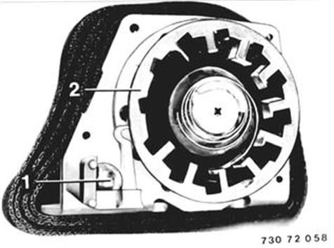 Rücksitz einbauen.Aussparung (1) muß in Haltelasche (2) einrasten.