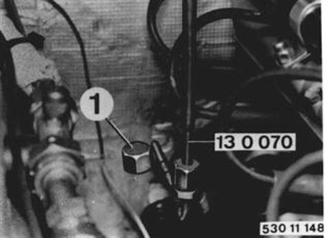 Checking Function of Oxygen Sensor Connect digital tester. Adjust engine idle speed 13 00 054. Unscrew plug nut (1). Install CO tester 13 0 070 in exhaust line. Connect CO tester. 13 00 054