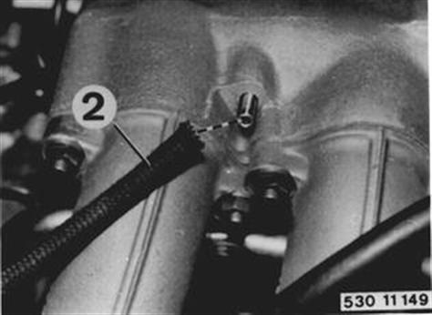 Pull off hose (2) from collector to carbon canister. Don´t plug opening. Measure and note CO level value. CO level must be between 0.2 and 0.8% by volume CO level too low: 1.) Leak in intake system after air flow sensor. Check intake pipes, intake neck, hoses and connections for leaks. 2.) Leak in crankcase. Check valve cover seal, oil pan, oil dipstick and vent line for leaks. | ![]() |