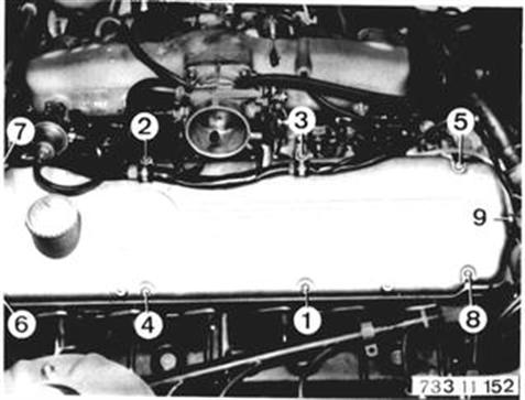 Unscrew cylinder head cover. Installation: Tighten nuts and bolts in order of 1 through 9. | ![]() |