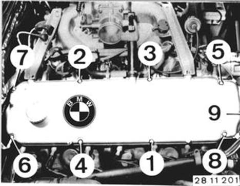 Take off cylinder head cover. Installation: Check gasket, replacing if necessary. Check that gasket fits correctly and tighten bolts in order of 1 through 9. Mount clamp with bolt (9). Tightening torque*. * See Specifications