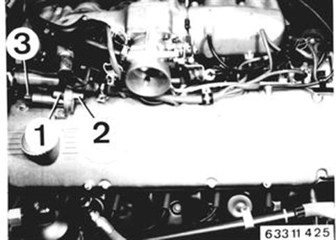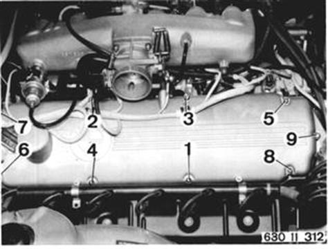 Vehicles after change point in 1982 REMOVING AND INSTALLING CYLINDER HEAD COVER M 30 B 32: Pull off plug (2) and lift out wires. Pull out hoses (3 and 4). Loosen hose clamp (5). Disconnect wire. Unscrew nuts (6) and remove air cleaner with air flow sensor. | ![]() |