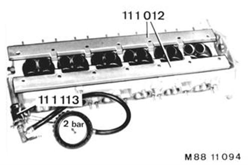 Bolt on Special Tool 11 1 012. Mount Special Tool 11 1 113. Supply air pressure to cylinder head - testing pressure = 2 bar (28 psi) - and check head for cracks in a water bath. Note: Relax the water bath with a detergent if necessary.