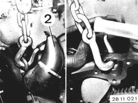 Disconnect water hose (2) and apply Special Tool 11 0 020. Lift engine. | ![]() |
