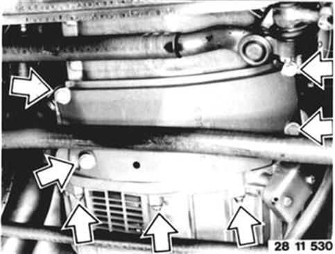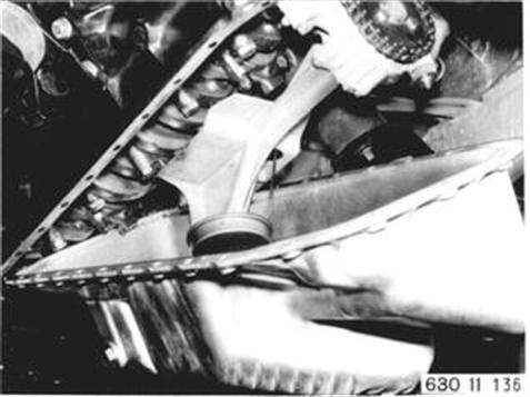 Remove air cleaner housing 13 71 000. Take off oil pan. Turn crankshaft until conrod no. 6 is above mating surface of crankcase. Unscrew engine mounts right top and bottom. Lift engine on right bracket until oil pan can be removed. Installation: Replace gasket. 13 71 000