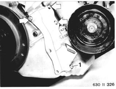 Remove bolt (1). Loosen other bolts only enough that bolts on oil pan can be unscrewed. Installation: Install bracket without stress. Use spacer between bracket and oil pan. Spacers are available in different thicknesses. | ![]() |