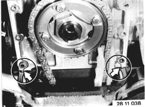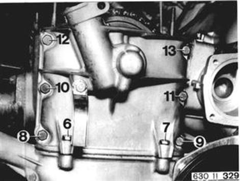 Loosen timing case cover. Installation: Tighten bolts 6 and 7 finger tight. Now tighten bolts 8 ... 13 in order and them tighten 6 and 7 fully. | ![]() |